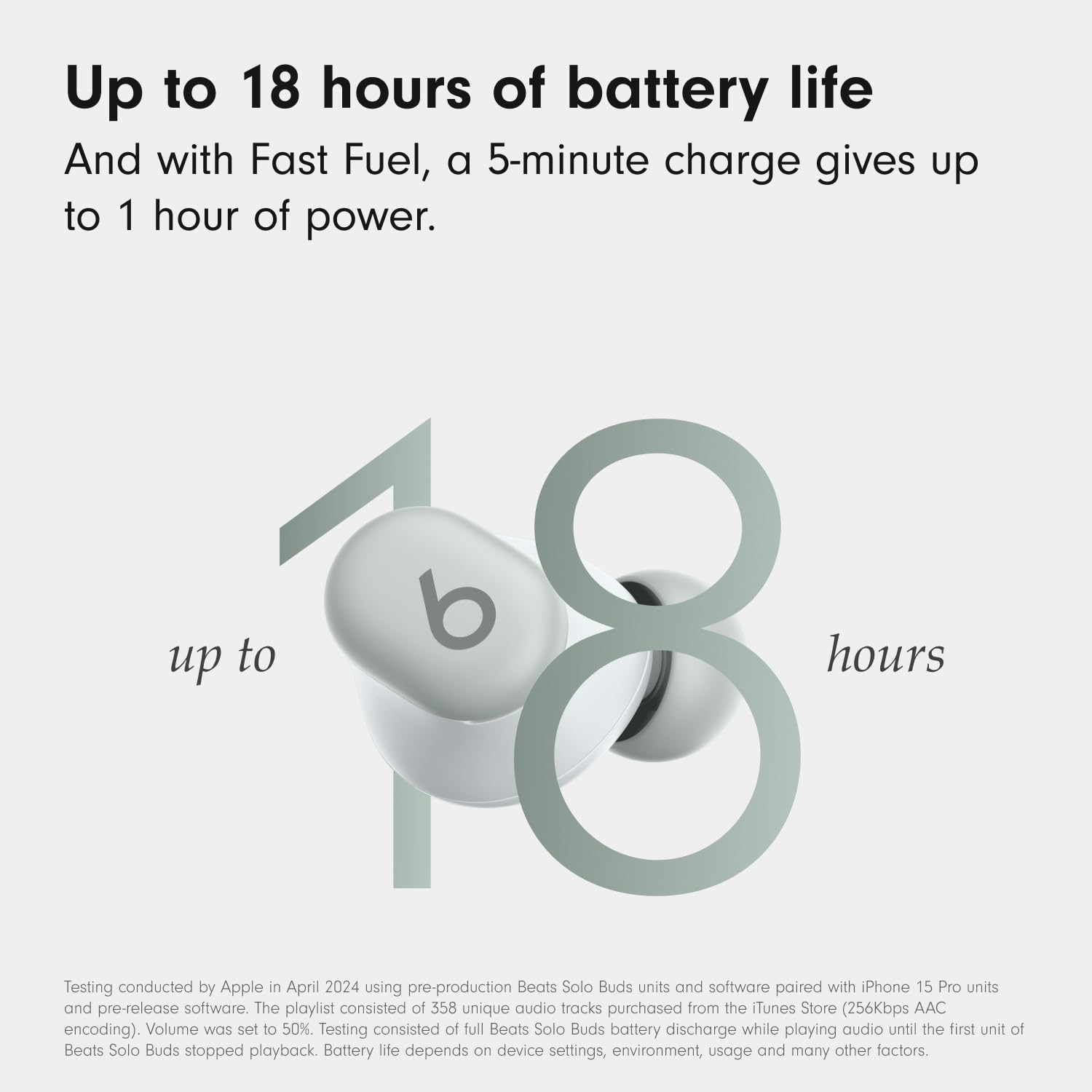 Up to 18 hours of battery life. Fast Fuel, a 5-minute charge, gives up to 1 hour of playback. POWER ADAPTER AND USB-C CHARGING CABLE SOLD SEPARATELY.