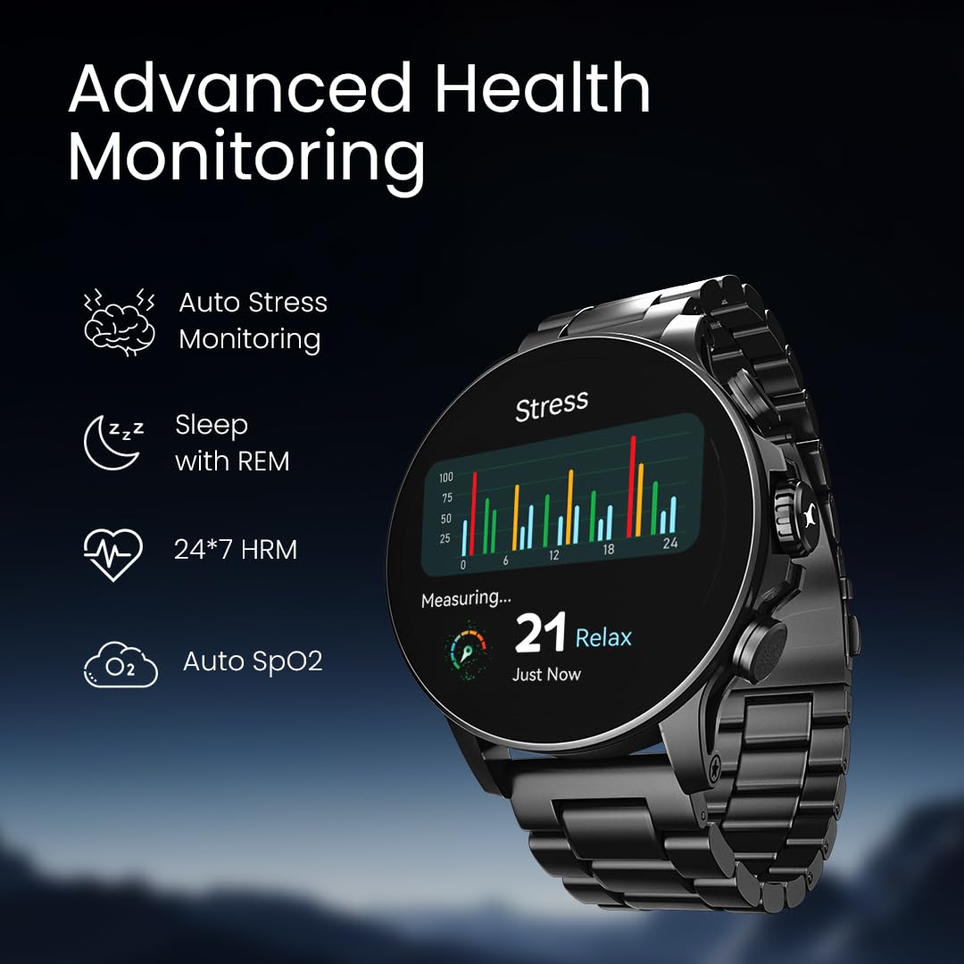 3.9 CM Super AMOLED Display with 480×480 resolution and 1000 nits peak brightness, delivering crisp visuals even under direct sunlight. Equipped with a dual-core chipset and fluidic UI for a seamless user experience, along with dynamic watch faces for personalized styling. SingleSync™ BT Calling and quick reply support for easy communication, along with music storage to enjoy tunes on the go. Comprehensive health and wellness tracking, including 24/7 heart rate monitoring, SpO2, sleep monitoring with REM, auto stress monitor, womens health, and 100+ sports modes. IP68 water resistance and a powerful 5-day battery life, with additional features like functional crown, inbuilt games, alarm, stopwatch, timer, and music and camera control.