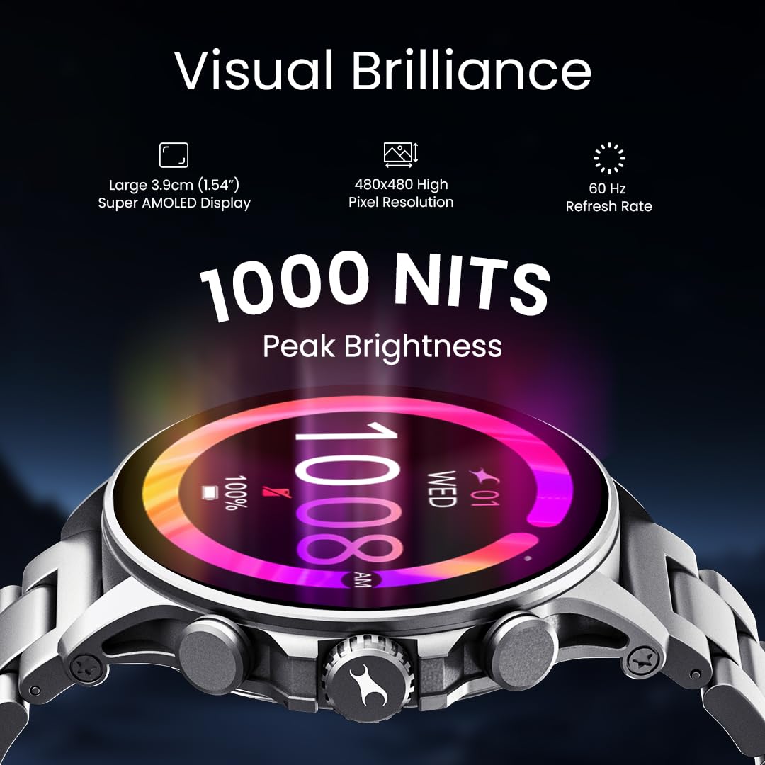 - 1.54” Super AMOLED Display – Experience crisp 480×480 resolution, 1000 nits brightness & 60Hz refresh rate for stunning clarity. A smart watch for man & woman that combines vibrant visuals with a premium touch.