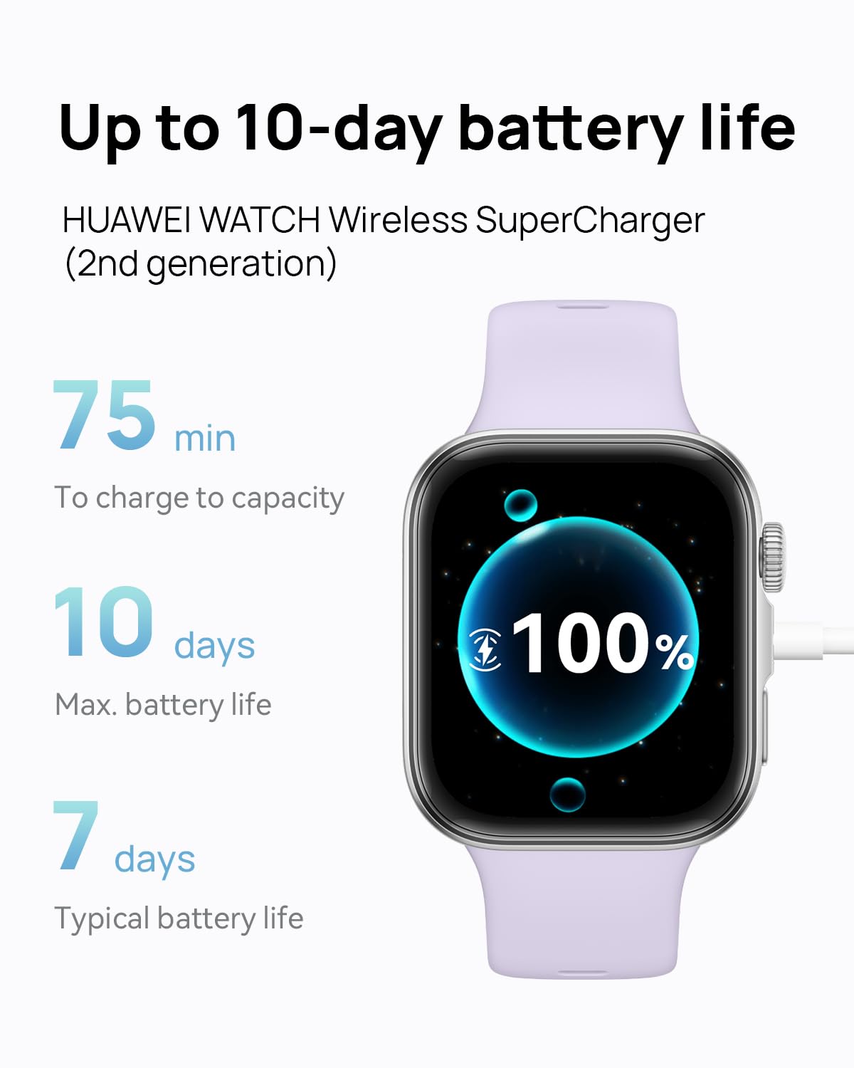 - Up to 10 days of battery life: Power for your whole day after only 10 minutes of charging time, thanks to the HUAWEI Watch Wireless SuperCharger.