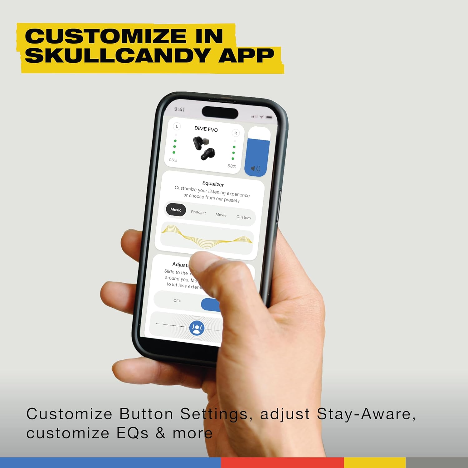 - ADJUSTABLE STAY-AWARE MODE. Hear what’s going on around you without taking your earbuds off. With adjustable levels through the Skullcandy App, you decide how much of the outside world you let in.